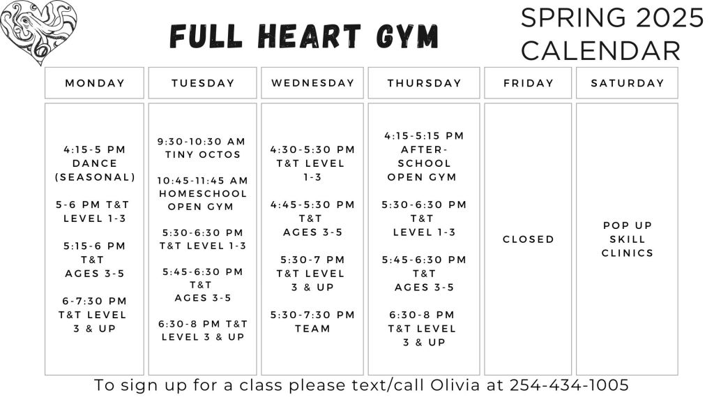 Spring Schedule 2025 To register for a class, please contact Olivia (text/call). Share this: Click to share on Facebook (Opens in new window) Facebook Click to email a link to a friend (Opens in new window) Email