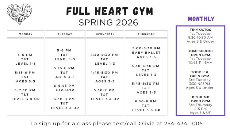 Spring Schedule 2026 To register for a class, please contact Olivia (text/call). Share this: Share on Facebook (Opens in new window) Facebook Email a link to a friend (Opens in new window) Email
